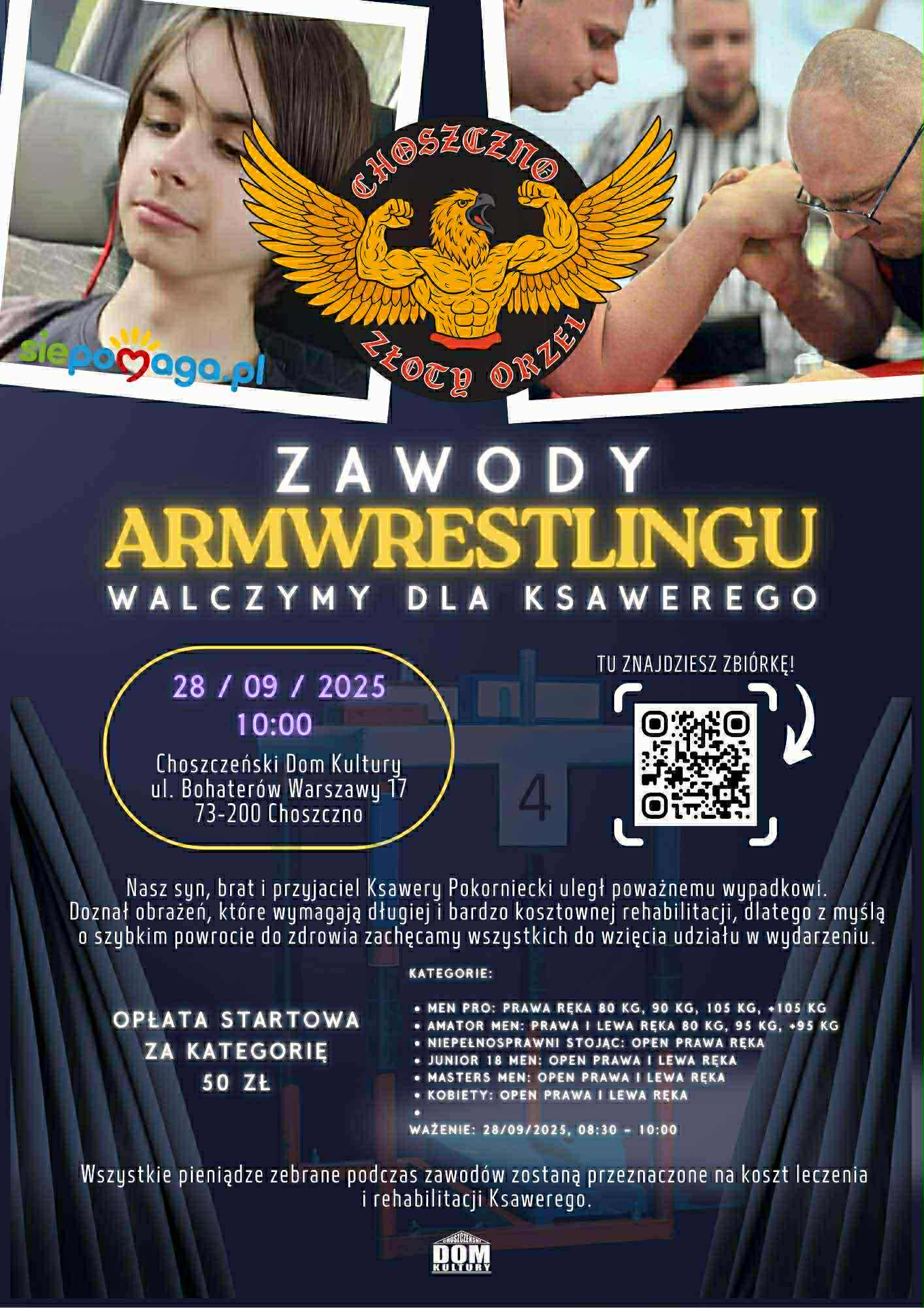 Organizatorem Charytatywnych Zawodów Armwrestlingu “Walczymy dla Ksawerego” jest Uczniowski Klub Sportowy “Złoty Orzeł” Choszczno, NIP: 594 15 16 738, ul. Stargardzka 39A/2, 73-200 Choszczno.